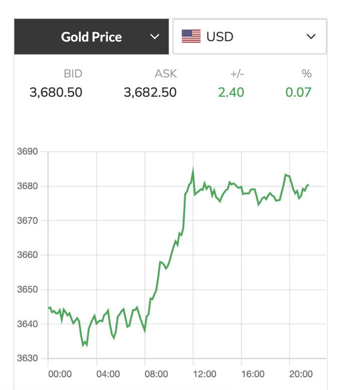 Giá vàng trong nước tăng trở lại theo đà đi lên mạnh mẽ của giá thế giới. Trên thị trường quốc tế, kim loại quý sáng nay được giao dịch ở mức 3.681 USD/ounce, tăng gần 50 USD/ounce (tương đương mức tăng 1,6 triệu đồng/lượng).
