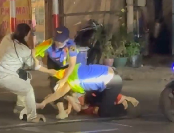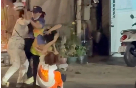 Chưa dừng lại, sau khi đoàn tàu đi qua, người phụ nữ bất ngờ lao vào hành hung hai nữ nhân viên. Một người thân đứng gần đó cũng tham gia, túm tóc chị Thúy kéo ngã xuống đường.