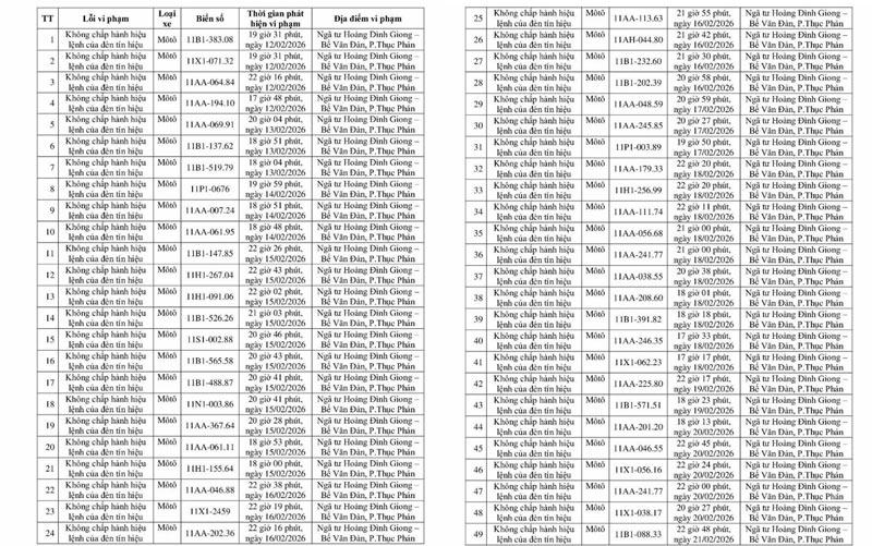 Theo báo cáo của Phòng Cảnh sát giao thông, Công an tỉnh Ninh Bình, từ ngày 23/2 đến ngày 1/3 qua khai thác hệ thống camera giám sát và sử dụng thiết bị nghiệp vụ, lực lượng cảnh sát giao thông đã ghi nhận nhiều trường hợp vượt đèn đỏ. Danh sách như sau: