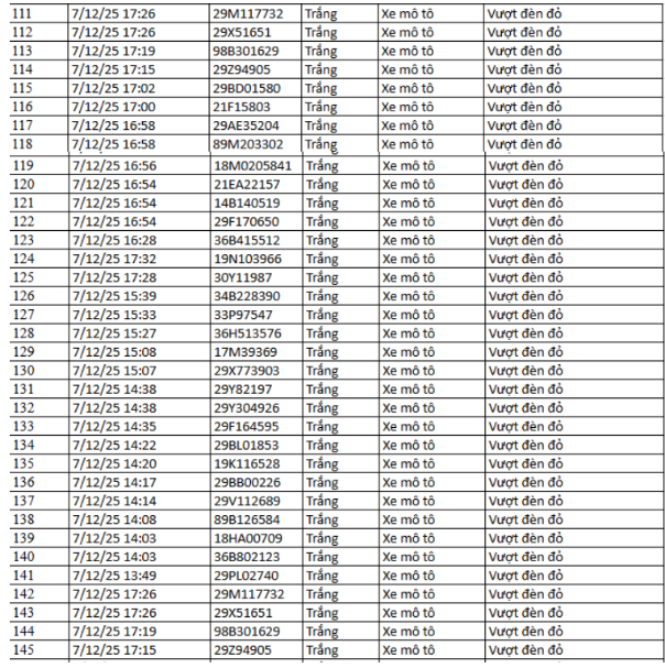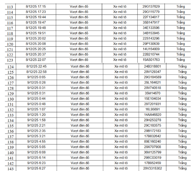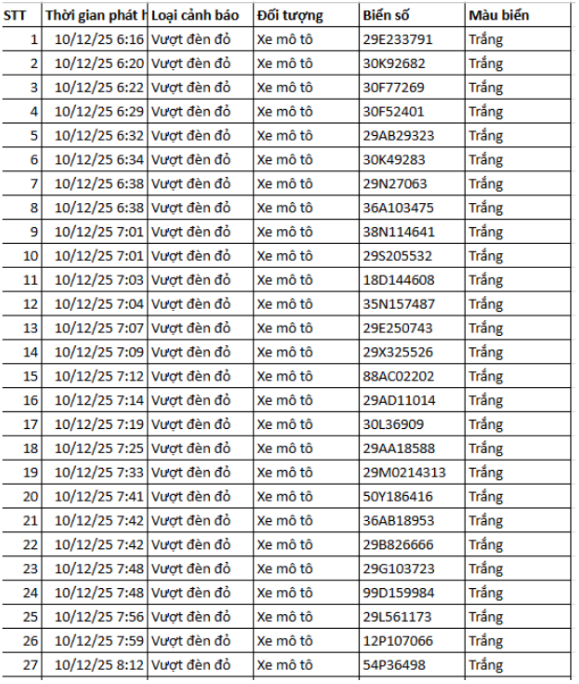 Theo Cục Cảnh sát giao thông, từ 12h00’ ngày 9/12/2025 đến 12h00’ ngày 10/12/2025, qua trích xuất dữ liệu từ camera A.I được thí điểm lắp đặt tại nội đô Hà Nội (nút giao phố Phạm Văn Bạch – Hoàng Quán Chi), đã tự động phát hiện 129 trường hợp xe mô tô (xe máy) vi phạm.