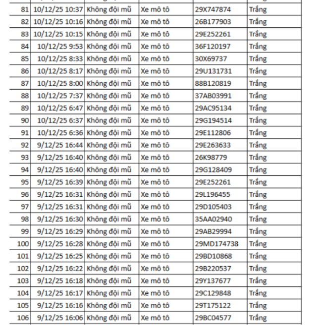 Ngày 9/12, Phòng CSGT Công an tỉnh Bắc Ninh thông báo danh sách các phương tiện vi phạm bị phạt nguội từ ngày 30/11 đến 07/12/2025.