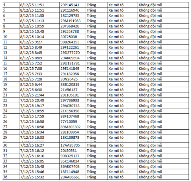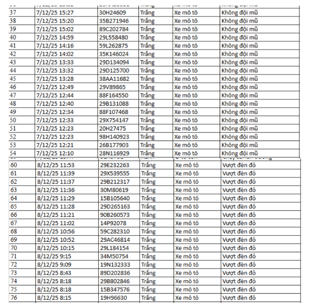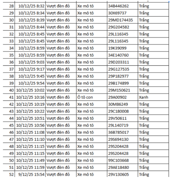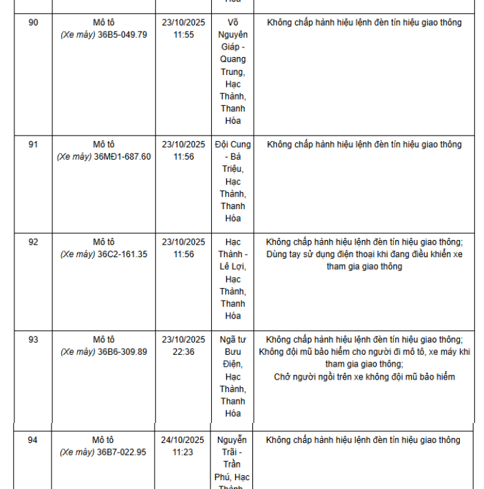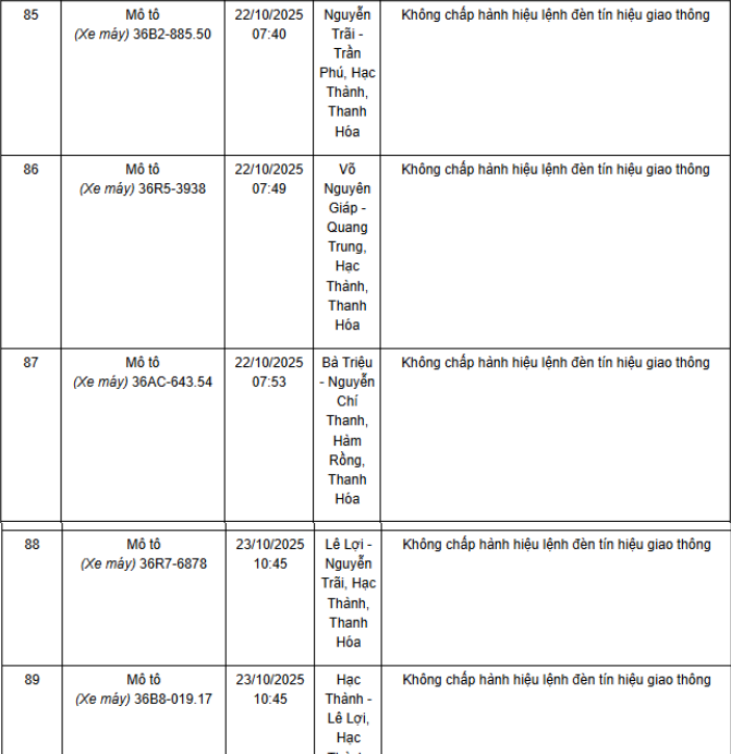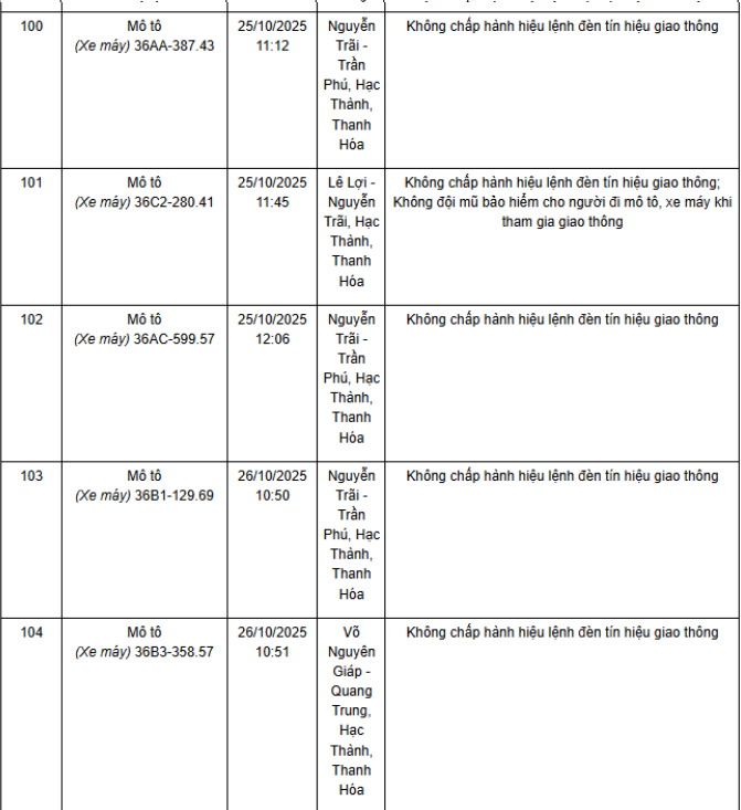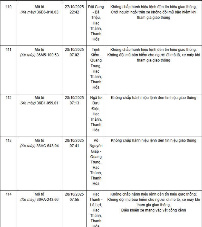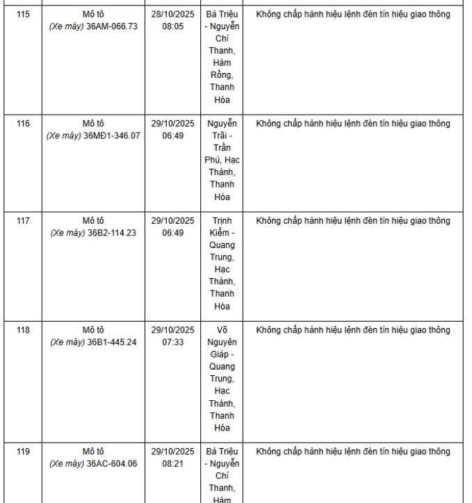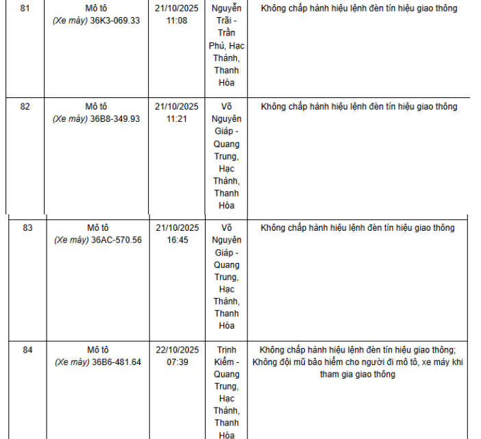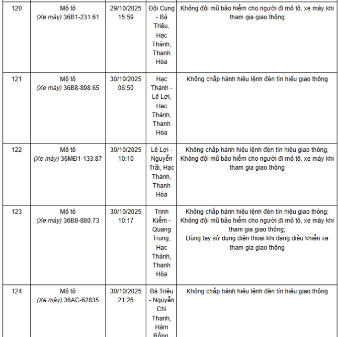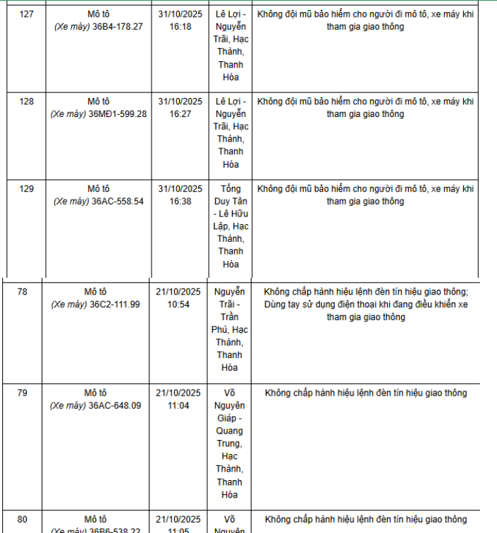 Ngày 1/12, Phòng CSGT Công an tỉnh Thanh Hóa thông báo các phương tiện vi phạm về TTATGT đường bộ được phát hiện qua Hệ thống camera giám sát an ninh, trật tự và an toàn giao thông trên địa bàn từ ngày 20/10/2025 đến ngày 31/10/2025. Theo danh sách, có 52 trường hợp xe máy vi phạm.