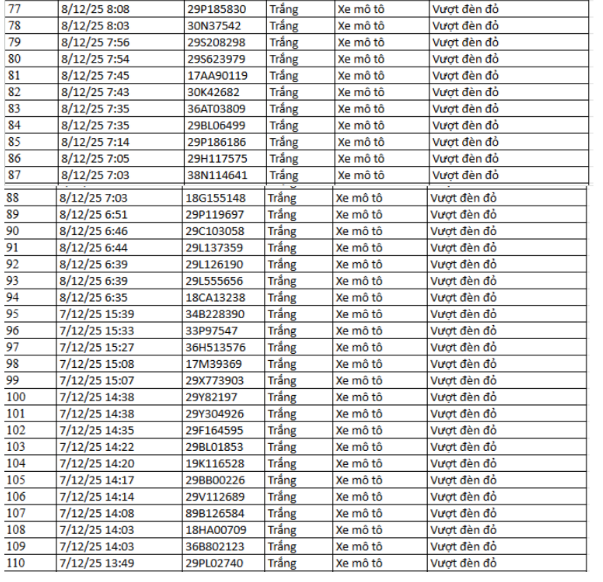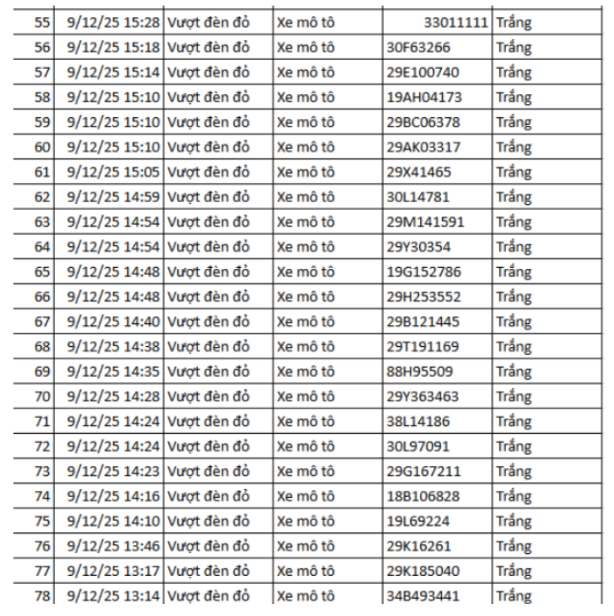 Danh sách cụ thể 78 trường hợp xe máy vi phạm như sau: