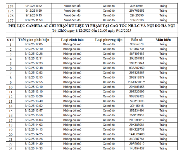Trước đó, từ 12h00’ ngày 8/12/2025 đến 12h00’ ngày 9/12/2025, qua trích xuất dữ liệu từ camera A.I được thí điểm lắp đặt tại nội đô Hà Nội (nút giao phố Phạm Văn Bạch – Hoàng Quán Chi), đã tự động phát hiện 176 trường hợp xe mô tô (xe máy) vi phạm.
