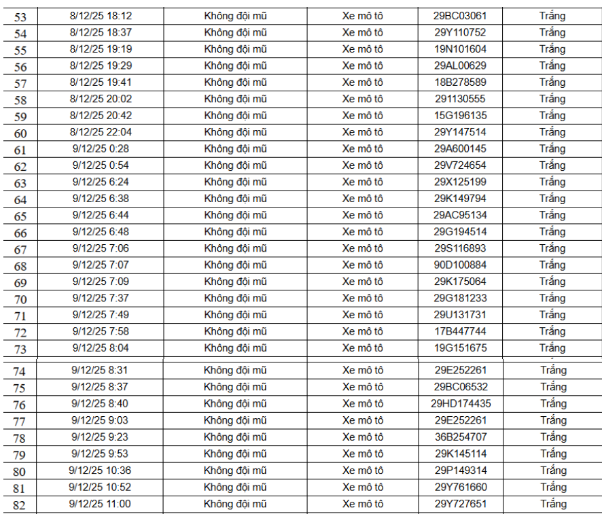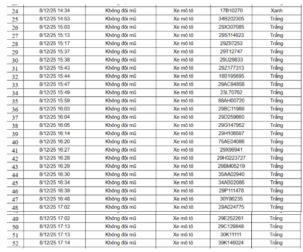 Danh sách 52 trường hợp xe máy vi phạm như sau: