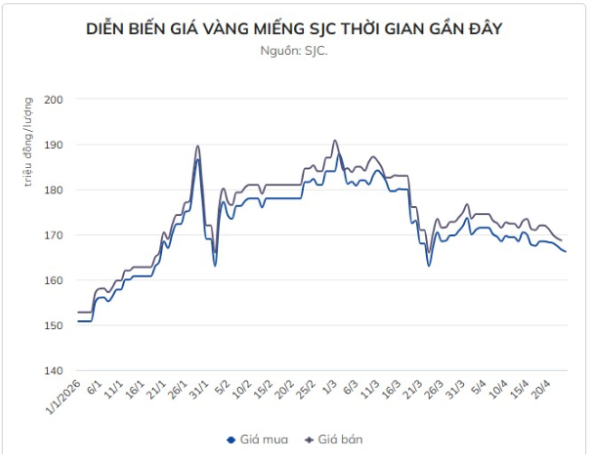 Cụ thể, Công ty TNHH MTV Vàng bạc đá quý Sài Gòn (SJC) niêm yết giá vàng miếng ở mức 166,2 – 168,7 triệu đồng/lượng, giảm 500.000 đồng so với giá chốt phiên liền trước (23/4). Mức chênh lệch giữa giá mua vào và bán ra vẫn duy trì ở biên độ cao.