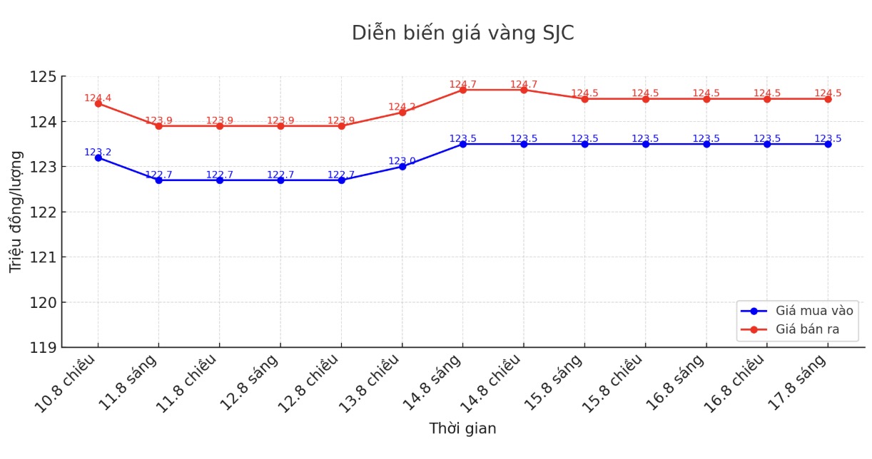 So với chốt phiên giao dịch tuần trước (10.8.2025), giá vàng miếng SJC tại Công ty VBĐQ Sài Gòn SJC tăng 300.000 đồng/lượng chiều mua vào và tăng 100.000 đồng/lượng chiều bán ra. Chênh lệch giá mua – bán vàng SJC tại Công ty VBĐQ Sài Gòn SJC ở ngưỡng 1 triệu đồng/lượng.