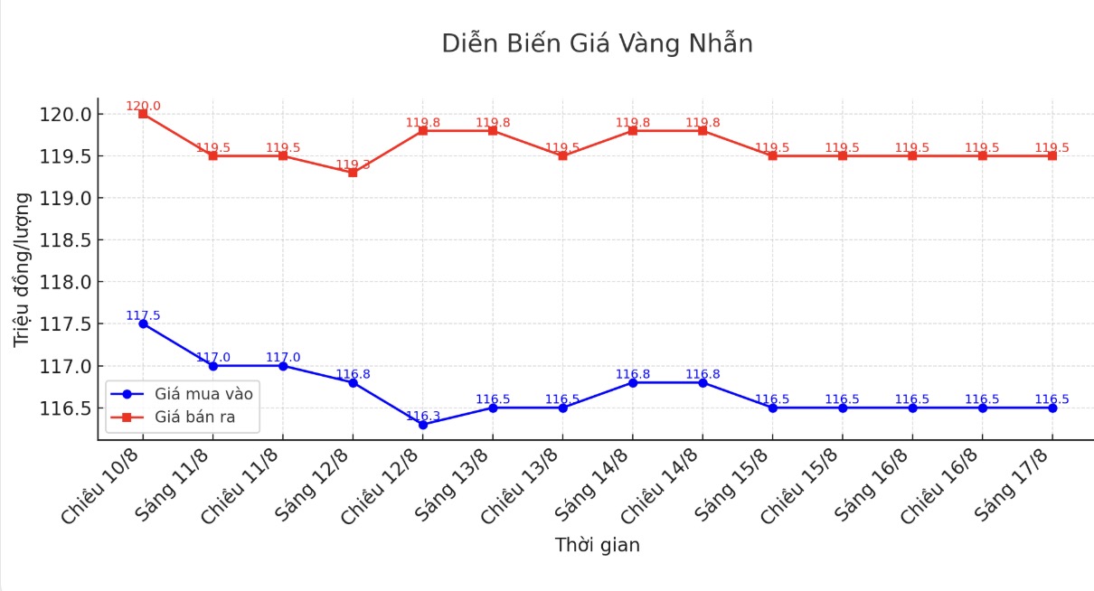 Tập đoàn Vàng Bạc Đá Quý Phú Quý niêm yết giá vàng nhẫn ở ngưỡng 116,4-119,4 triệu đồng/lượng (mua vào – bán ra), giảm 600.000 đồng/lượng cả hai chiều so với một tuần trước. Chênh lệch mua vào – bán ra ở mức 3 triệu đồng/lượng.