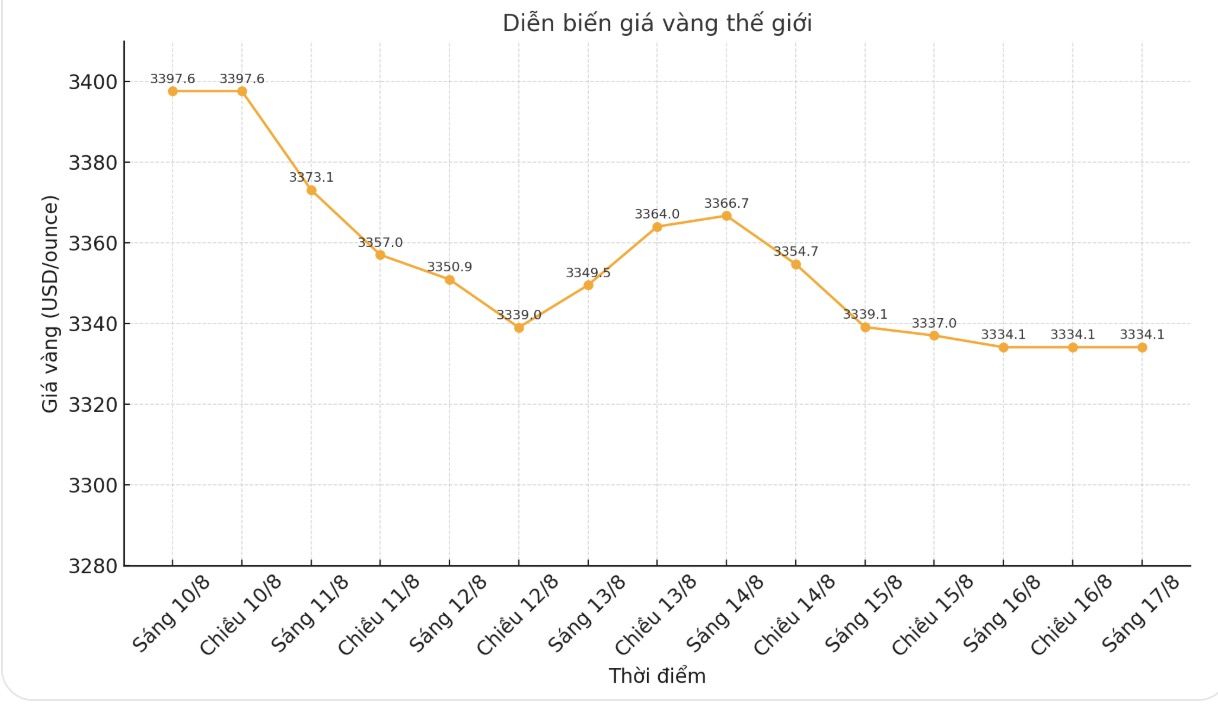 Đóng cửa phiên giao dịch tuần, giá vàng thế giới niêm yết ở ngưỡng 3.334,1 USD/ounce, giảm 63,5 USD/ounce so với chốt phiên giao dịch tuần trước.