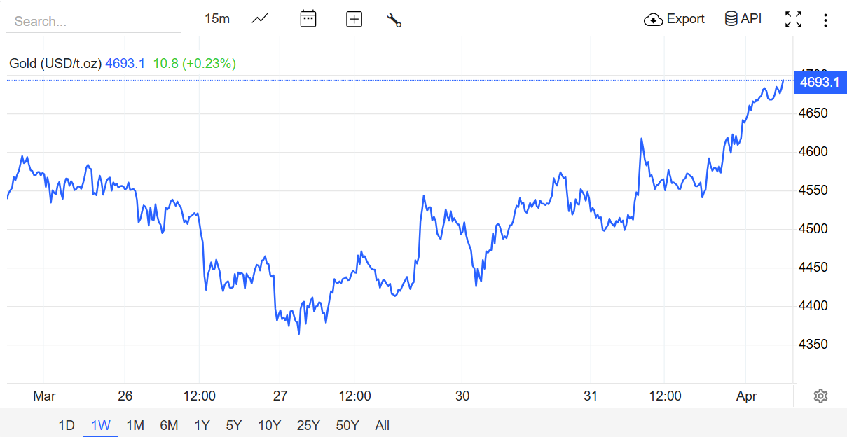 Gía vàng thế giới giao ngay trên thị trường châu Á lúc 6 giờ 30 phút sáng hôm nay ngày 1/4 (giờ Việt Nam) giao dịch ở quanh ngưỡng 4.693 USD/ounce, tăng mạnh 180 USD/ounce so với cùng thời điểm hôm qua.