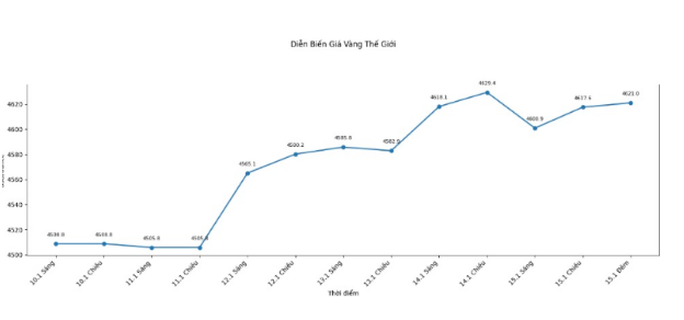 Giá vàng thế giới giao ngay niêm yết lúc 23h20 ngày 15.1 ở ngưỡng 4.621 USD/ounce, tăng 7,6 USD.