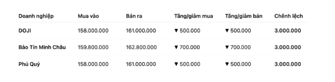 Tập đoàn Vàng Bạc Đá Quý Phú Quý niêm yết giá vàng nhẫn ở ngưỡng 158-161 triệu đồng/lượng (mua vào – bán ra), giảm 500.000 đồng/lượng cả hai chiều. Chênh lệch mua vào – bán ra ở mức 3 triệu đồng/lượng