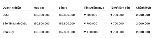 Tập đoàn Vàng Bạc Đá Quý Phú Quý niêm yết giá vàng miếng SJC ở ngưỡng 160-162,8 triệu đồng/lượng (mua vào – bán ra), giảm 1 triệu đồng/lượng chiều mua vào và giảm 700.000 đồng/lượng chiều bán ra. Chênh lệch giá mua vào – bán ra ở ngưỡng 2,8 triệu đồng/lượng.