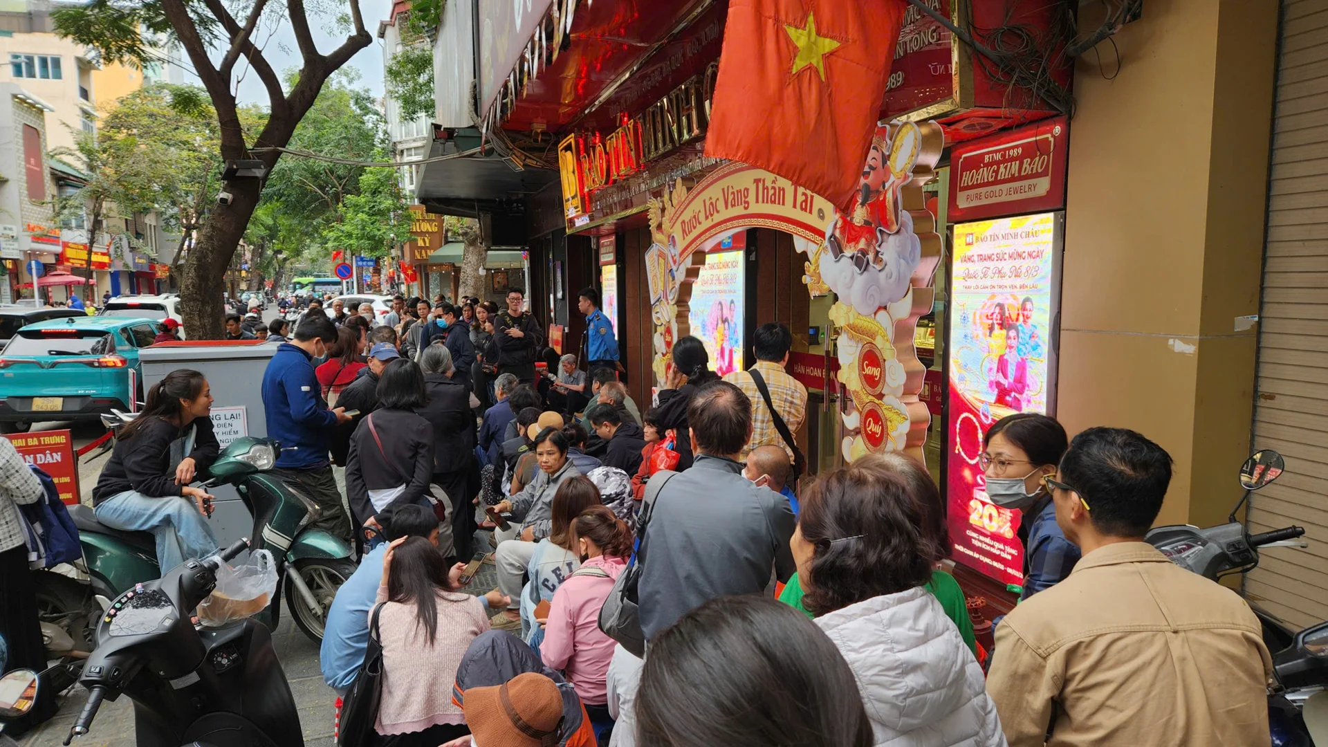 Người mua cũng tập trung đông đúc tại trước cửa hàng Bảo Tín Mạnh Hải trên phố Trần Nhân Tông trước giờ mở bán. Ảnh: Thái Nguyễn