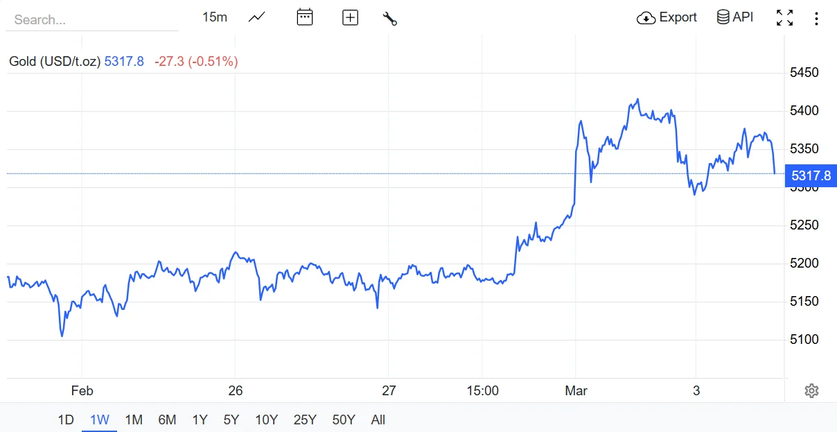 Giá vàng thế giới giao ngay trên thị trường châu Á lúc 13 giờ hôm nay ngày 3/3 (giờ Việt Nam) giao dịch ở quanh ngưỡng 5.317 USD/ounce, giảm mạnh 46 USD/ounce so với cùng thời điểm hôm qua.