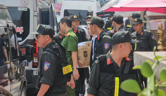Việc khám xét được triển khai từ 8 giờ sáng với hàng chục cán bộ, chiến sĩ tham gia, phối hợp cảnh sát cơ động phong tỏa, đảm bảo an ninh trật tự.