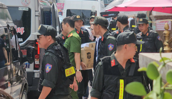 Ghi nhận tại hiện trường, khoảng 12 giờ 30, lực lượng công an sử dụng nhiều ô tô khách biển vàng đưa đi nhiều người cùng khoảng ba thùng lớn chứa tài liệu, vật chứng liên quan.