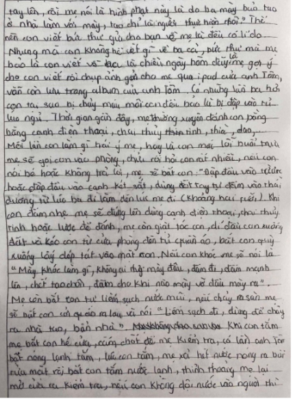 “Thằng bé ngoan và hiền lắm. Dù bị đối xử như thế nào cũng chưa bao giờ kêu than, chia sẻ với bố hay ông bà. Cho đến khi bố yêu cầu, cháu mới viết ra tường tận. Giờ sự việc thế nào thì có pháp luật giải quyết. Tôi chỉ mong cháu được sống bình yên”, bà V. bật khóc chia sẻ.