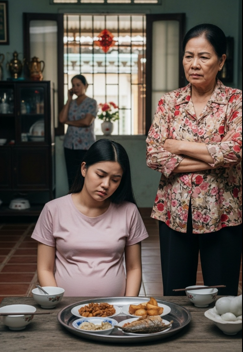 Tôi quay sang nhìn bà Thủy, bà vẫn đang mỉm cười, nụ cười chứa đầy sự hả hê ẩn giấu. “Sao, Mai thấy mẹ nấu ăn được không? Toàn là đồ mẹ chọn kỹ đấy, phải ăn mặn một chút thì mới hấp thụ được, không thì thai nhi không đủ chất đâu. Mẹ nghe nói món cá kho mặn này là bổ nhất cho bà bầu đấy.” Giọng bà Thủy đầy sự châm chọc và mỉa mai.