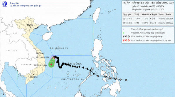 Theo Trung tâm Dự báo Khí tượng Thủy văn Quốc gia, lúc 1 giờ ngày 2/12, vị trí tâm áp thấp nhiệt đới ở vào khoảng 14,4 độ Vĩ Bắc; 111,2 độ Kinh Đông, trên vùng biển phía Tây Bắc khu vực Giữa Biển Đông. Sức gió mạnh nhất vùng gần tâm áp thấp nhiệt đới mạnh cấp 6 (39- 49km/h), giật cấp 8. Di chuyển chậm theo hướng Nam Tây Nam.
