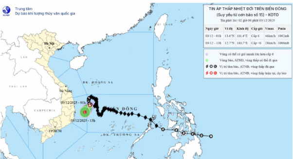 Trong khi đó, bão số 15 đã suy yếu thành áp thấp nhiệt đới. Vào hồi 1h ngày 3.12, vị trí tâm áp thấp nhiệt đới ở 13,6 độ vĩ bắc, 111,4 độ kinh đông, thuộc vùng biển tây bắc giữa Biển Đông. Sức gió mạnh nhất cấp 6, giật cấp 8. Di chuyển chậm, hướng nam tây nam, 3 km/h.
