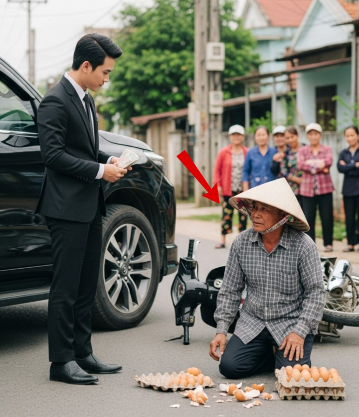 Chiếc ô tô màu đen bóng loáng rẽ gấp ở khúc cua làng, tiếng phanh “két” chói tai vang lên, rồi rầm! — một chiếc xe máy cà tàng chở hai sọt trứng lớn đổ nhào ra đường. Trứng vỡ nhoe nhoét, vàng trắng loang lổ giữa nắng trưa.