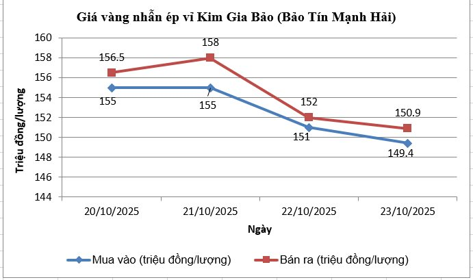 Sáng nay (23/10), thị trường vàng trong nước tiếp tục chứng kiến đợt điều chỉnh mạnh sau khi liên tục lập đỉnh mới trong tuần trước. Tại hệ thống Bảo Tín Mạnh Hải, giá vàng nhẫn ép vỉ Kim Gia Bảo hiện chỉ niêm yết quanh mức 149,4 – 150,9 triệu đồng/lượng (mua – bán), giảm tới 7,1 triệu đồng/lượng so với đỉnh lịch sử ngày 21/10 là 157 – 158 triệu đồng/lượng.