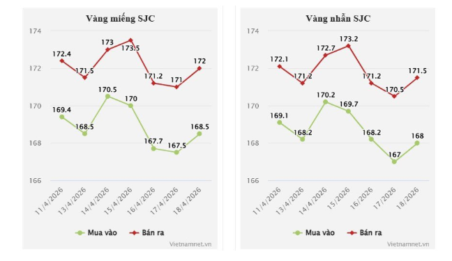 Ngày 18/4, giá vàng miếng SJC tăng 1 triệu đồng/lượng so với phiên liền trước, giao dịch ở mức 168,5-172 triệu đồng/lượng (mua vào – bán ra).