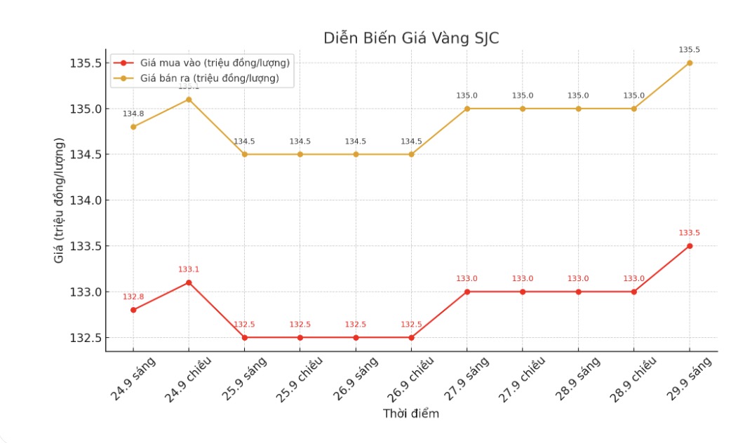 Tập đoàn Vàng Bạc Đá Quý Phú Quý niêm yết giá vàng miếng SJC ở ngưỡng 133-135,5 triệu đồng/lượng (mua vào – bán ra), tăng 500.000 đồng/lượng cả hai chiều. Chênh lệch giá mua vào – bán ra ở ngưỡng 2,5 triệu đồng/lượng.