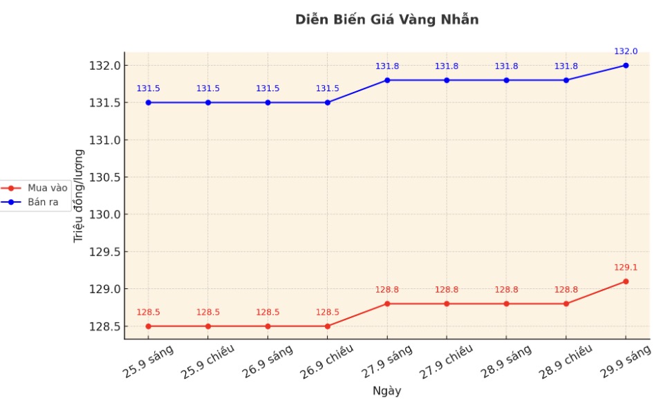 Tập đoàn Vàng Bạc Đá Quý Phú Quý niêm yết giá vàng nhẫn ở ngưỡng 129-132 triệu đồng/lượng (mua vào – bán ra), tăng 200.000 đồng/lượng cả hai chiều. Chênh lệch mua vào – bán ra ở mức 3 triệu đồng/lượng.