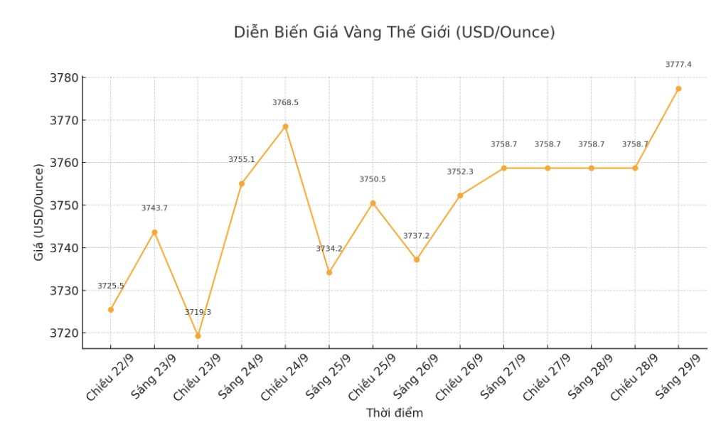 Lúc 9h10, giá vàng thế giới niêm yết quanh ngưỡng 3.777,4 USD/ounce, tăng 18,7 USD so với một ngày trước.