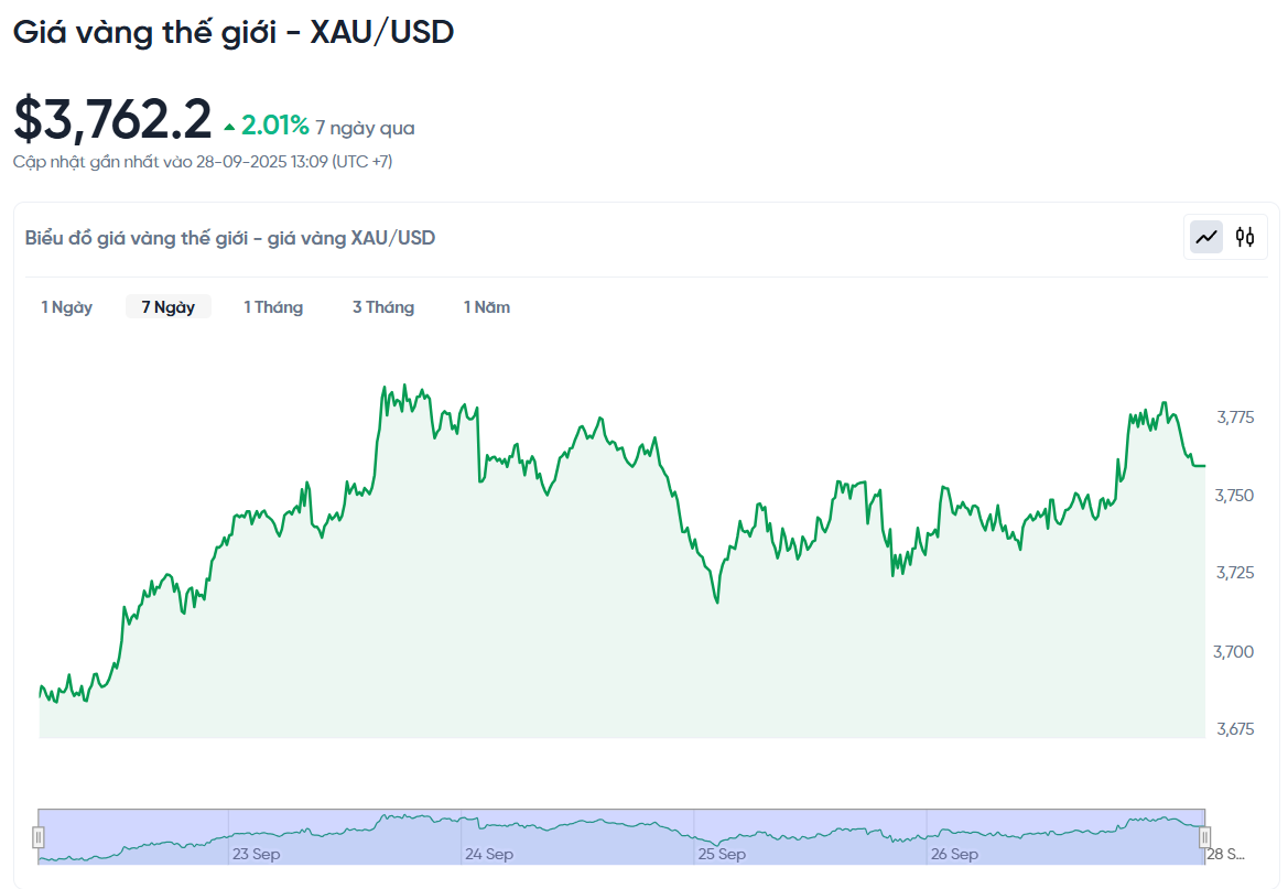 Giá vàng thế giới hôm nay 29/9/2025 và biểu đồ biến động giá vàng thế giới 24h qua