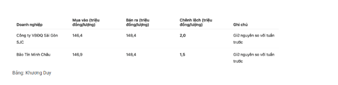 Trong khi đó, Bảo Tín Minh Châu niêm yết giá vàng miếng SJC ở ngưỡng 146,9-148,4 triệu đồng/lượng (mua vào – bán ra).