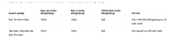 Bảo Tín Minh Châu niêm yết giá vàng nhẫn ở ngưỡng 145,8-148,8 triệu đồng/lượng (mua vào – bán ra); giảm 400.000 đồng/lượng cả hai chiều. Chênh lệch mua vào – bán ra ở ngưỡng 3 triệu đồng/lượng.