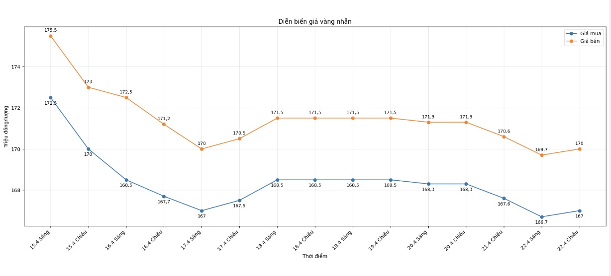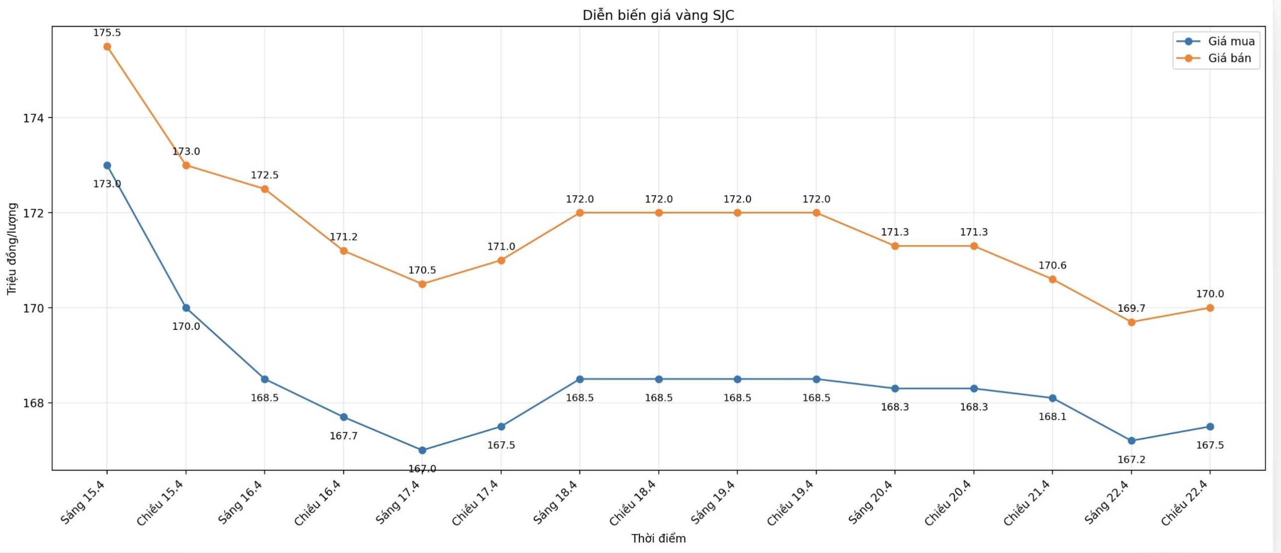 Trong phiên ngày 22/4, giá vàng biến động theo xu hướng giảm là chủ đạo, có thời điểm giảm tới 900.000 đồng/lượng so với phiên trước, trước khi hồi phục nhẹ vào cuối ngày khoảng 300.000 đồng/lượng; tính chung cả phiên, giá vàng miếng và vàng nhẫn vẫn giảm khoảng 400.000–600.000 đồng/lượng so với ngày 21/4.