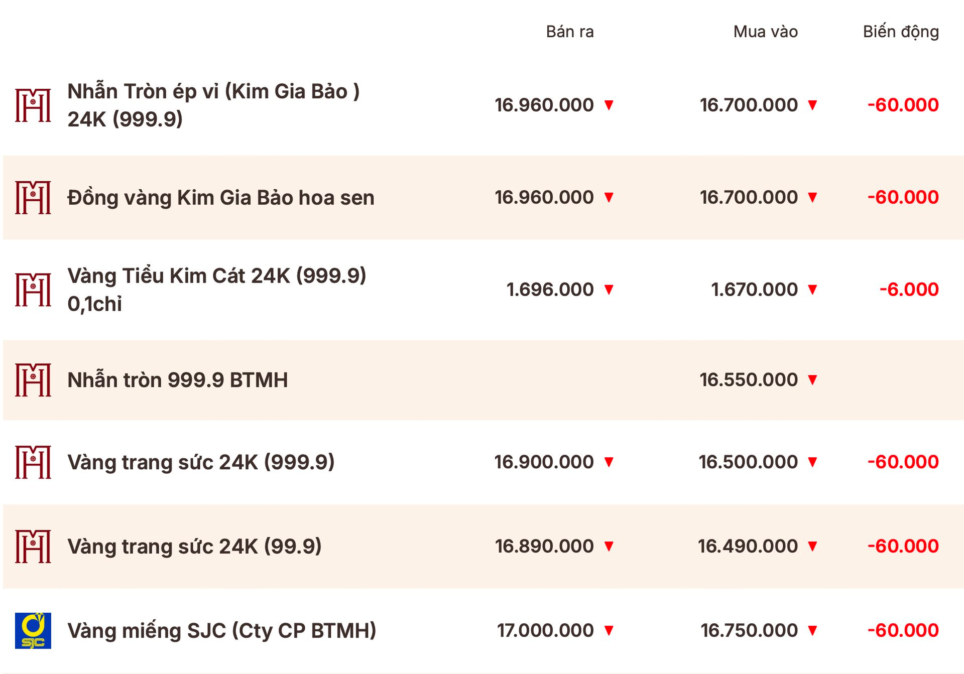 Bảo Tín Minh Châu niêm yết giá vàng nhẫn ở ngưỡng 167-170 triệu đồng/lượng (mua vào – bán ra), giảm 600.000 đồng/lượng cả hai chiều mua vào và bán ra. Chênh lệch giá mua vào – bán ra ở ngưỡng 3 triệu đồng/lượng.