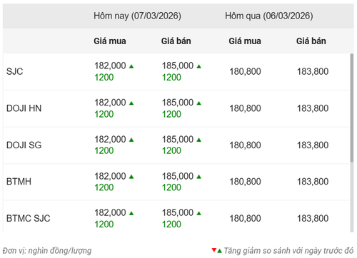 Cụ thể, tại thời điểm 12 giờ 30 phút ngày 7/3, Công ty Vàng bạc đá quý Sài Gòn (SJC) niêm yết giá vàng miếng SJC mua vào-bán ra ở mức 182-185 triệu đồng/lượng, tăng 1,2 triệu đồng mỗi lượng ở cả chiều mua vào và chiều bán ra so chốt phiên hôm trước. Chênh lệch mua-bán ở mức 3 triệu đồng.