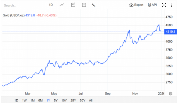 Giá vàng thế giới giao ngay chốt phiên cuối cùng năm 2025 tại thị trường Mỹ vào rạng sáng 1/1 (giờ Việt Nam) ở quanh mức 4.317 USD/ounce, giảm 21 USD/ounce so với chốt phiên trước đó tại thị trường này và tăng hơn 62% so với cùng thời điểm năm trước.