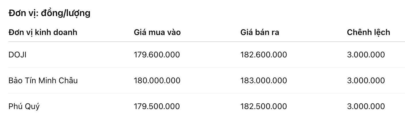 Tính đến 6h00, giá vàng miếng SJC được Tập đoàn DOJI niêm yết ở ngưỡng 179,6-182,6 triệu đồng/lượng (mua vào – bán ra). Chênh lệch giá mua vào – bán ra ở ngưỡng 3 triệu đồng/lượng.