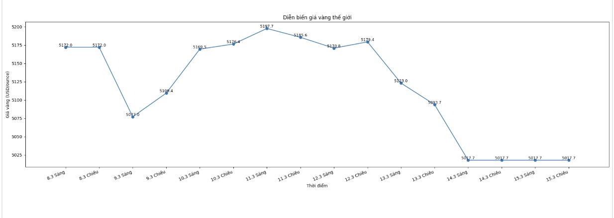 Tính đến 6 giờ ngày 17-3 (giờ Việt Nam), giá vàng hôm nay trên thị trường quốc tế dao động quanh mức 5.002 USD/ounce, giảm 36 USD so với mức cao nhất trong phiên giao dịch đêm qua (5.038 USD/ounce).