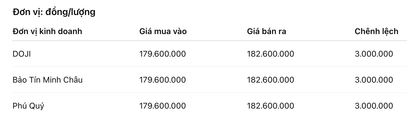Giá vàng miếng SJC được Bảo Tín Minh Châu niêm yết ở ngưỡng 179,6-182,6 triệu đồng/lượng (mua vào – bán ra). Chênh lệch giá mua vào – bán ra ở ngưỡng 3 triệu đồng/lượng.