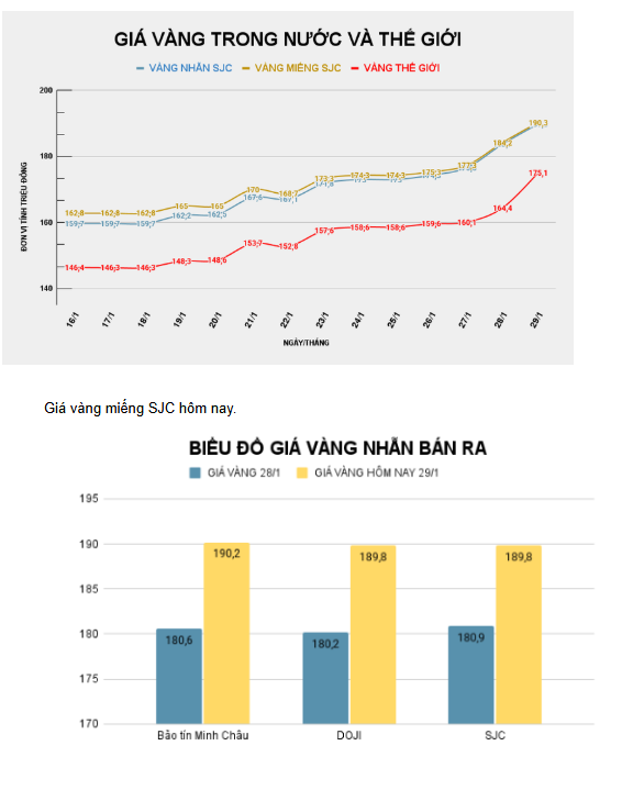 Sáng 29/1, Công ty vàng bạc đá quý Sài Gòn, Doji, Bảo Tín Minh Châu niêm yết giá vàng miếng SJC ở mức 187,3 triệu đồng/lượng ở chiều mua vào, bán ra ở mức 190,3 triệu đồng/lượng. Như vậy, giá vàng trong nước tiếp tục thiết lập đỉnh mới, tăng 8,9 triệu đồng/lượng so với hôm qua (28/1).