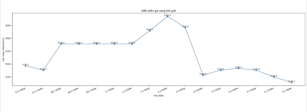 Lúc 9h30, giá vàng thế giới niêm yết quanh ngưỡng 5.128,7 USD/ounce, giảm 47,1 so với một ngày trước.