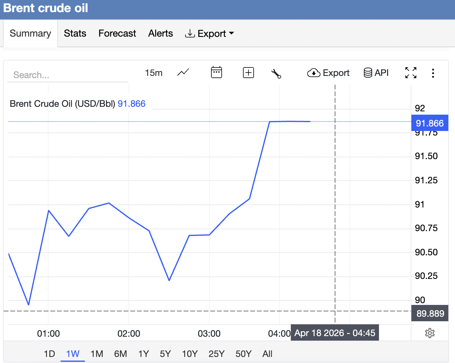 Trading Economics nhận định giá dầu Brent giao kỳ hạn đã giảm mạnh 10% xuống dưới 90 USD/thùng vào thứ Sáu, chạm mức thấp nhất trong gần 5 tuần sau khi Ngoại trưởng Iran Abbas Araghchi tuyên bố rằng eo biển Hormuz hiện đã hoàn toàn mở cửa cho giao thông thương mại trong thời gian ngừng bắn.