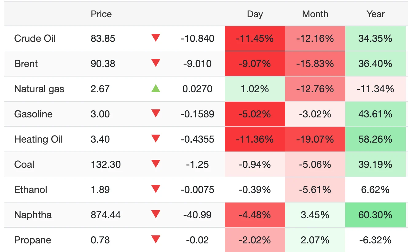 Giá dầu Brent giao sau đã lao dốc về dưới mốc 90 USD/thùng trong phiên, trước khi chốt tại 91,87 USD/thùng với mức giảm 7,520 USD, tương đương 7,57%. Đây là mức giá thấp nhất của dầu Brent trong gần 5 tuần qua. Dầu thô WTI của Mỹ còn giảm sâu hơn, mất 9,120 USD tương đương 9,63% và chốt ở 85,57 USD/thùng.