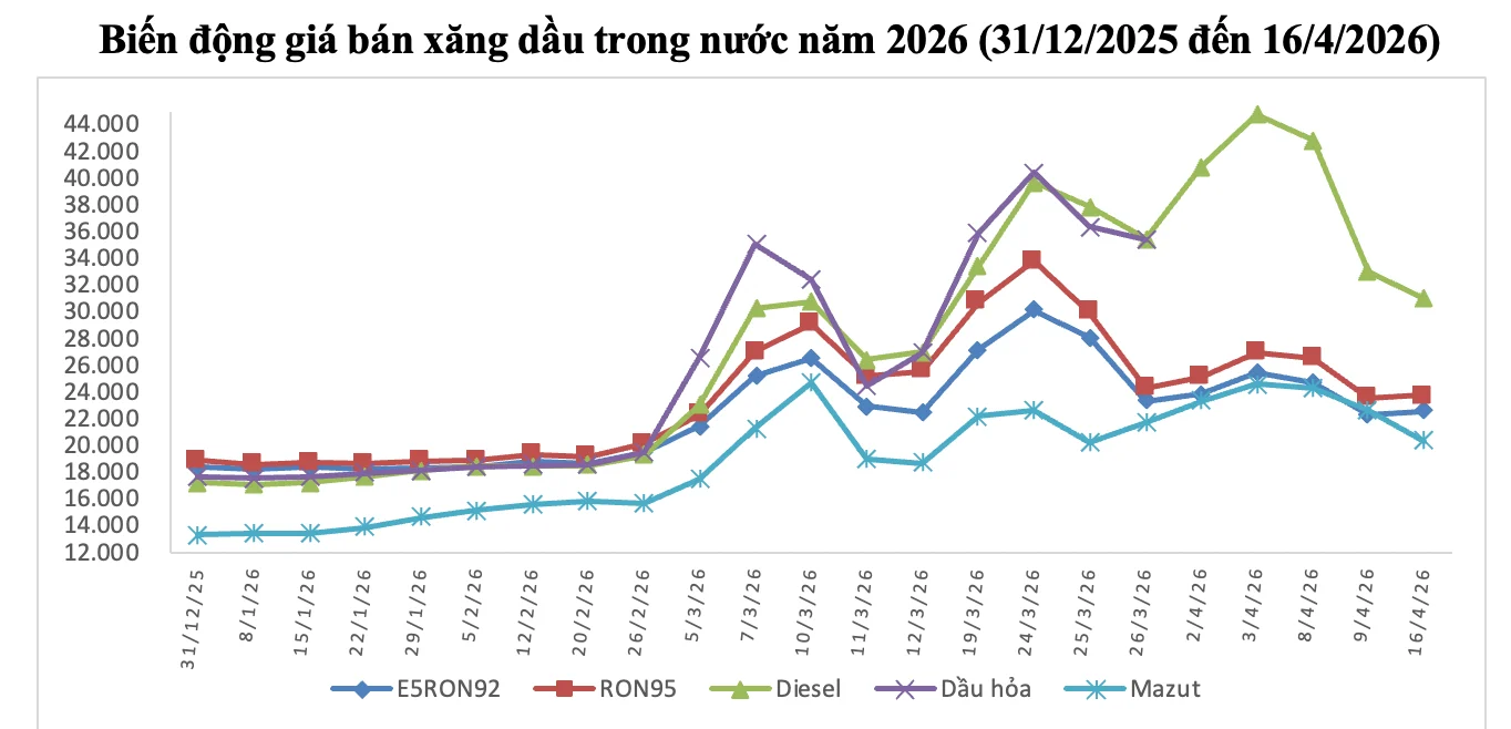 Tổng công ty Xăng dầu Quân đội (Mipecorp) điều chỉnh giá các mặt hàng xăng dầu từ 00h00′ ngày 16/4/2026, mức giá mới cụ thể như sau:
