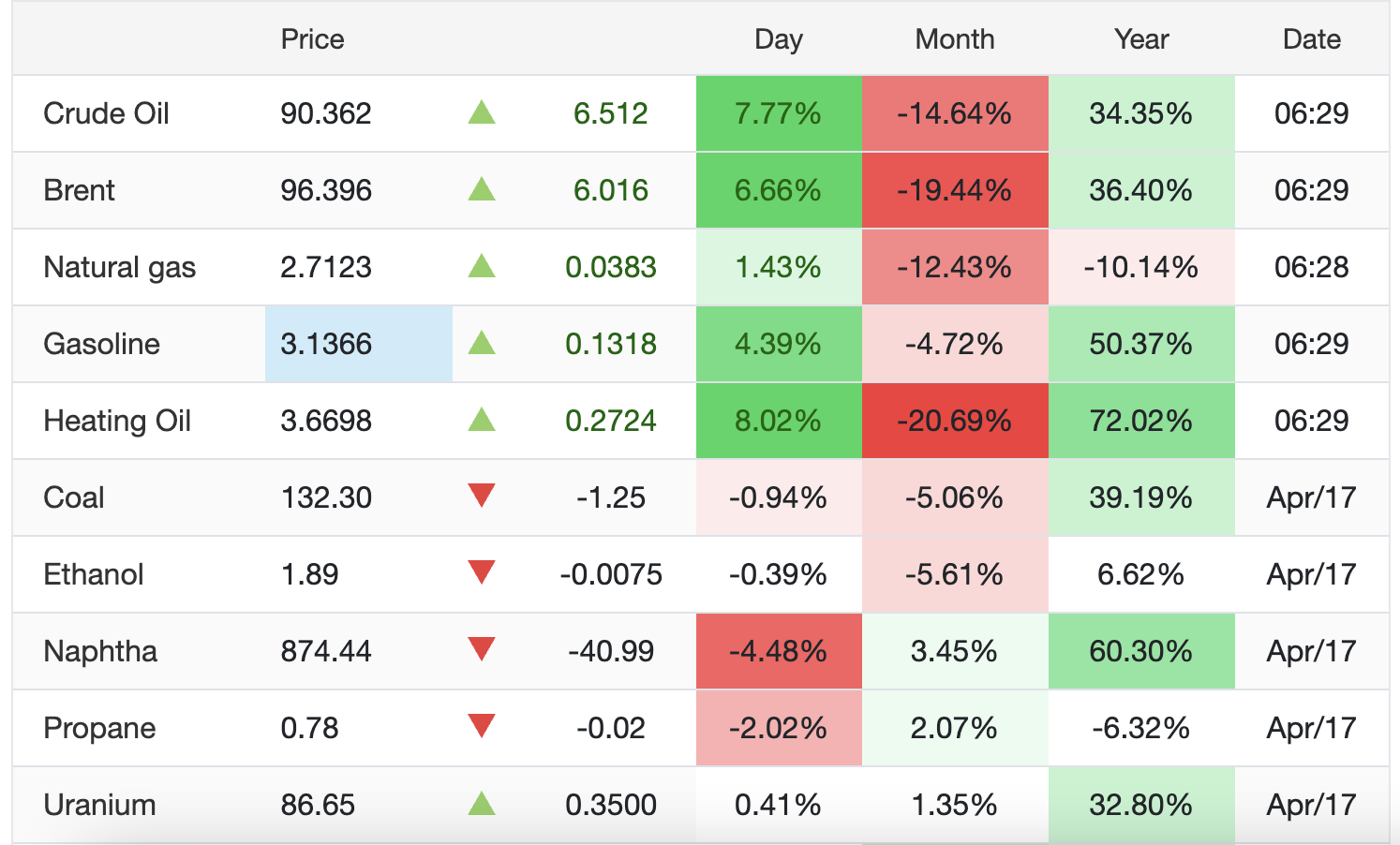 Rạng sáng nay lúc 6 giờ 30 (giờ Việt Nam), giá dầu thô trên thị trường quốc tế ghi nhận mức tăng giá rất mạnh. Trên sàn Trading Economics, giá dầu WTI giao dịch ở mức 90,3 USD/thùng, tăng tới 6,5 USD/thùng, tương ứng với mức tăng hơn 7,7% chỉ trong một ngày