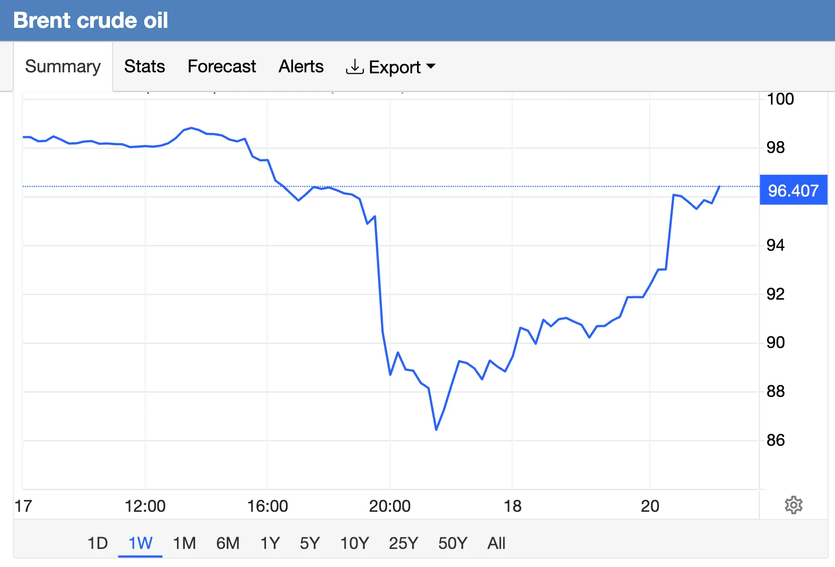 . Cùng thời điểm, dầu thô ngọt nhẹ Brent biển Bắc cũng bật tăng lên ngưỡng 96,4 USD/thùng, tăng 6 USD/thùng, tương đương tăng 6,66%.