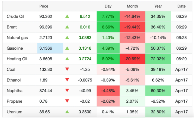 Rạng sáng nay lúc 6 giờ 30 (giờ Việt Nam), giá dầu thô trên thị trường quốc tế ghi nhận mức tăng giá rất mạnh. Trên sàn Trading Economics, giá dầu WTI giao dịch ở mức 90,3 USD/thùng, tăng tới 6,5 USD/thùng, tương ứng với mức tăng hơn 7,7% chỉ trong một ngày. Cùng thời điểm, dầu thô ngọt nhẹ Brent biển Bắc cũng bật tăng lên ngưỡng 96,4 USD/thùng, tăng 6 USD/thùng, tương đương tăng 6,66%.