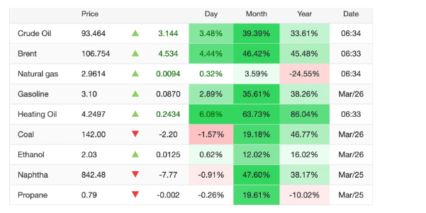 Ghi nhận trên thị trường giao dịch dầu thô thứ 6 ngày 27/3, lúc 6 giờ 34 phút, dầu WTI bán ra với giá 93,46 USD/thùng, tăng 3,1 USD, tăng 3,48% theo ngày. Trong khi dầu Brent biển Bắc bán ra ở mức 106,7 USD/thùng, tăng 4,5 USD/thùng, tương đương tăng 4,44% theo ngày. Giá xăng dầu trong nước tiếp tục suy giảm mạnh do Chính phủ can thiệp bằng chính sách thuế.